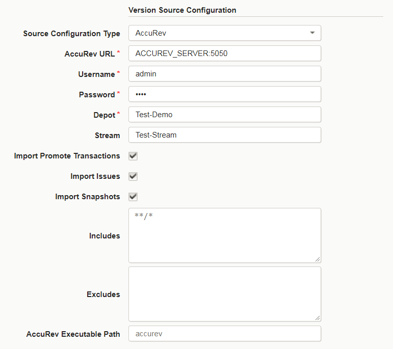 - AccuRev URL: (Required) The IP/Hostname and port of the AccuRev server. Run