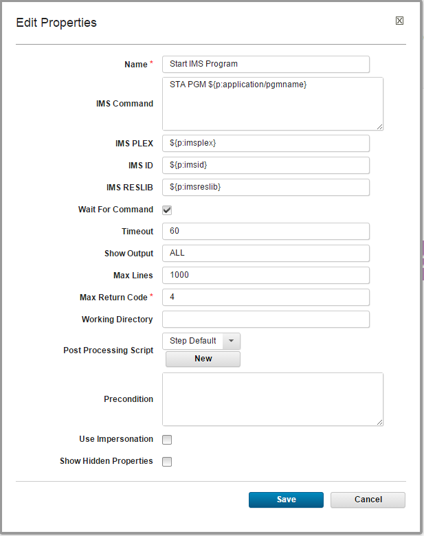 When the Execute IMS Command step is added to a process, the Edit Properties dialog opens. Provide the following required parameters specific to the IMS plug-in: