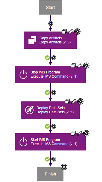 There are many possible ways to create processes for IMS application deployment. Process steps may differ depending on IMS environment setup, application details, and others. For example, under certain conditions, an existing application can be redeployed by a process that stops the run-time application, deploys a new version of application data sets, and restarts the application. The following example demonstrates how an DevOps Deploy process might look like for such a scenario: