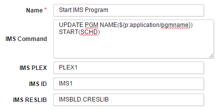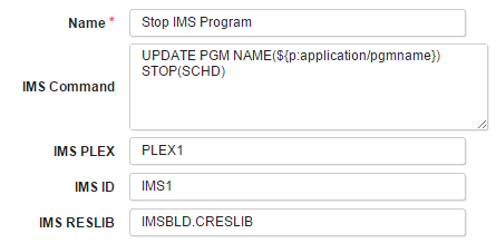 In this example, the IMS Plug-in is used twice. First, it is used to stop existing application by executing the UPDATE PGM NAME(*name*) STOP(SCHD) command. The plug-in parameters for this step might look as follows (the actual parameter values will be specific to your environment):