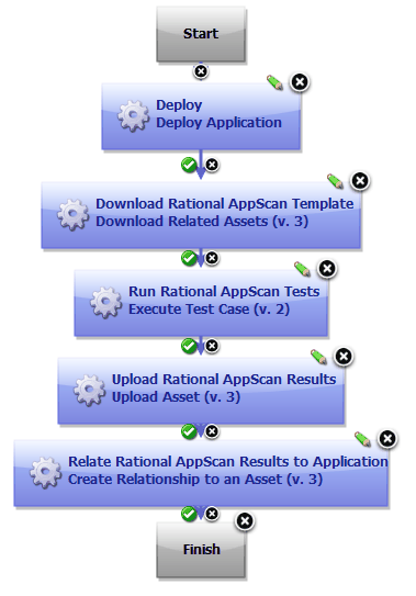 In this example, the component process deploys an application, runs an associated IBM Security AppScan test on the deployment, and updates the status of the asset in the library server, basing the status on the test results.