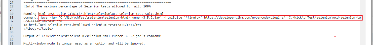 The command outlined here is the actual Selenium command the plug-in is running. For easy testing, this command can be copied and pasted into a terminal and run on your UCD agent. (The command must still have access to the selenium jar and test .html files.) By running the same command outside of the plug-in, you can confirm quickly if the root of your problem is related to the Selenium plug-in or jar.