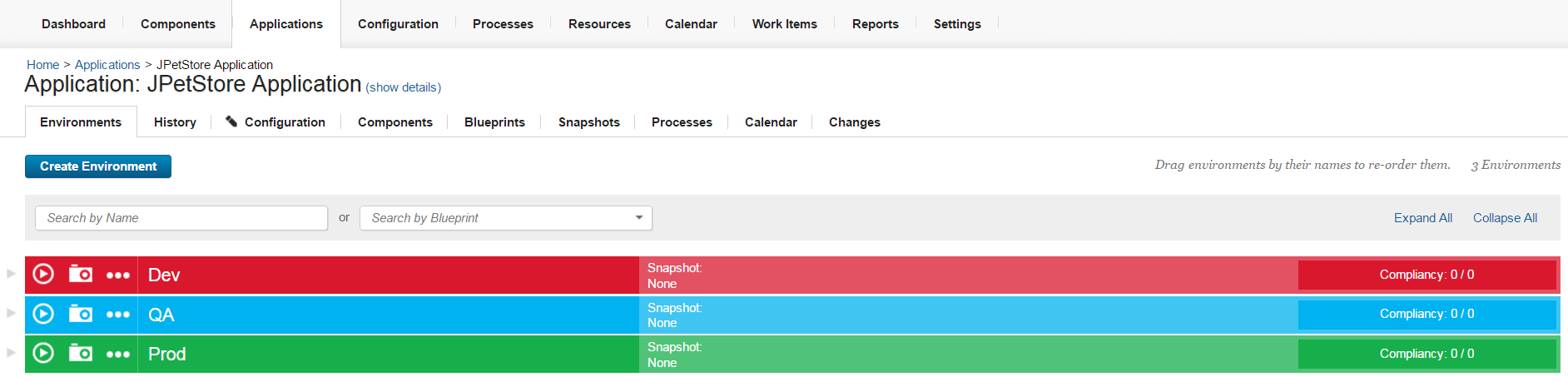 We will use the JPetStore Application in the graphic below to demonstrate the use of the ServiceNow agent pool in a deployment. The JPetStore Application example represents a project deployment strategy with three environments. The environments are shown on the Applications tab: Dev, QA, and Prod. The Components tab contains the various deployable items and concepts, that make up the application. In this example, it contains the ServiceNow component. The Processes tab contains deployment flows, when combined with the other component processes used to make dynamic decisions based on ServiceNow queried responses.