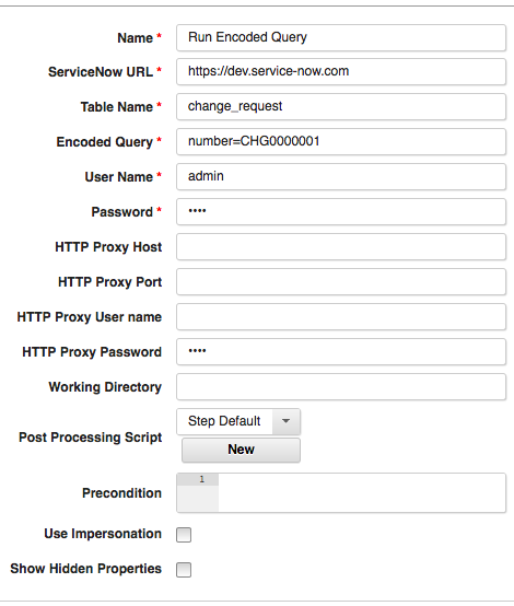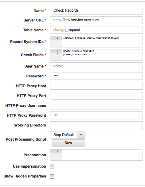 Note: For checking records in the change_request table, this process was combined into one step in Version 18 of the ServiceNow plug-in, in the step Check Change Request Fields.