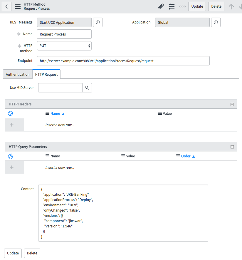 Name the message, and set up the Endpoint field to direct to your DevOps Deploy server, using the proper path for requesting an Application Process. This can also be used with any other UCD REST Endpoint if desired.