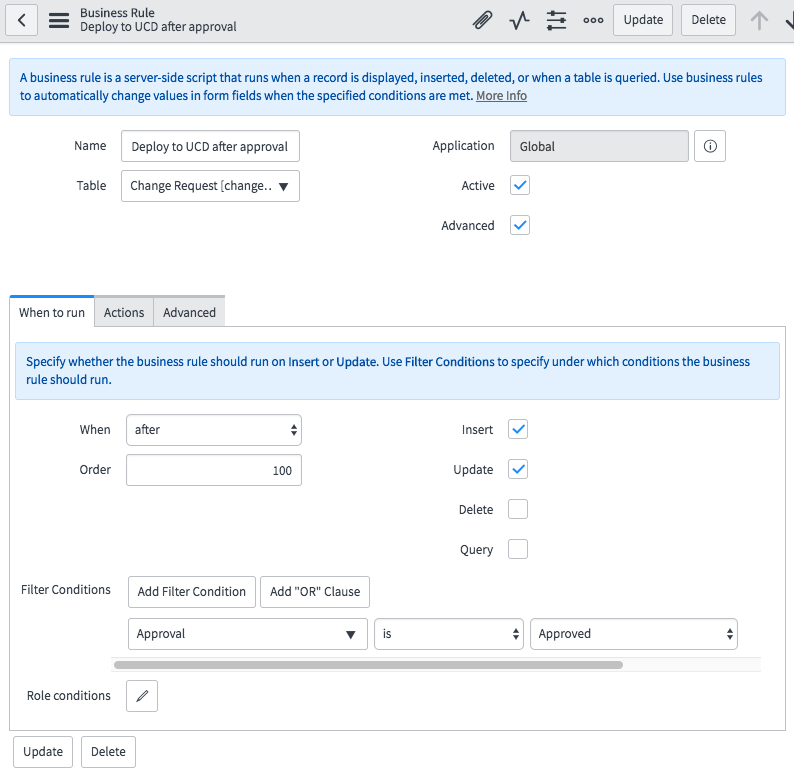 - Now that we have our Outbound REST Message, we need to configure a Business Rule.In the side panel, under System Definition -> Business Rules.Here we can configure a table that we want to trigger the REST Call from, as well as the conditions to do so.This depends on user preferences.For this case, the following parameters are set to trigger a deployment when a Change Request table has its approval status set to Approved.
