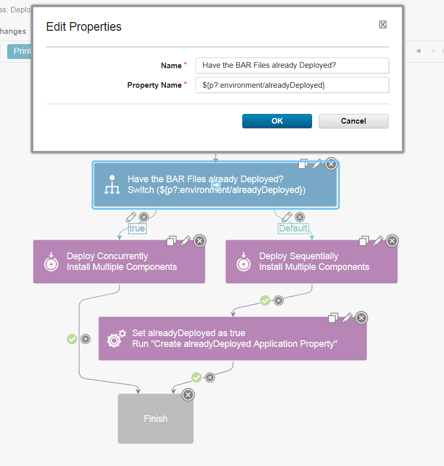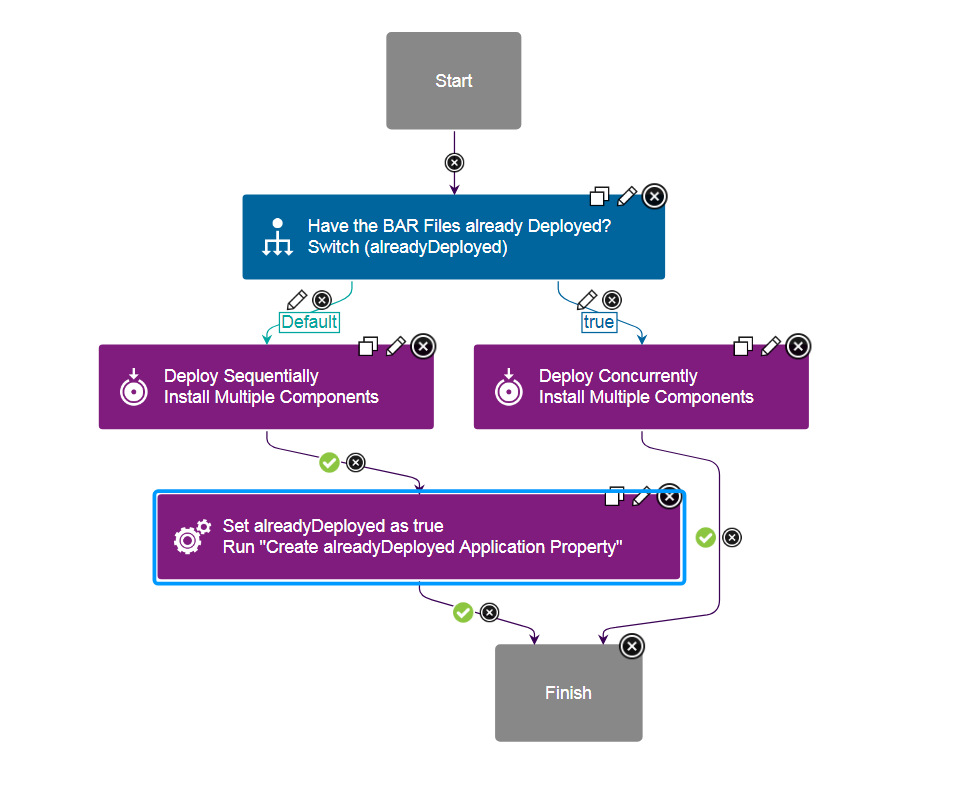 The above screenshot outlines the application process that will control the BAR files deployment. In this process, we assume that multiple components are being deployed simultaneously and are based on the same component template. The application process begins with a Switch step that looks for the alreadyDeployed application property. This property will govern whether to deploy the BAR files sequentially or concurrently. If this is the first time running this application process, the alreadyDeployed property should be undefined and guide the process down the Default branch. Otherwise, if alreadDeployed is found, the true branch will run.