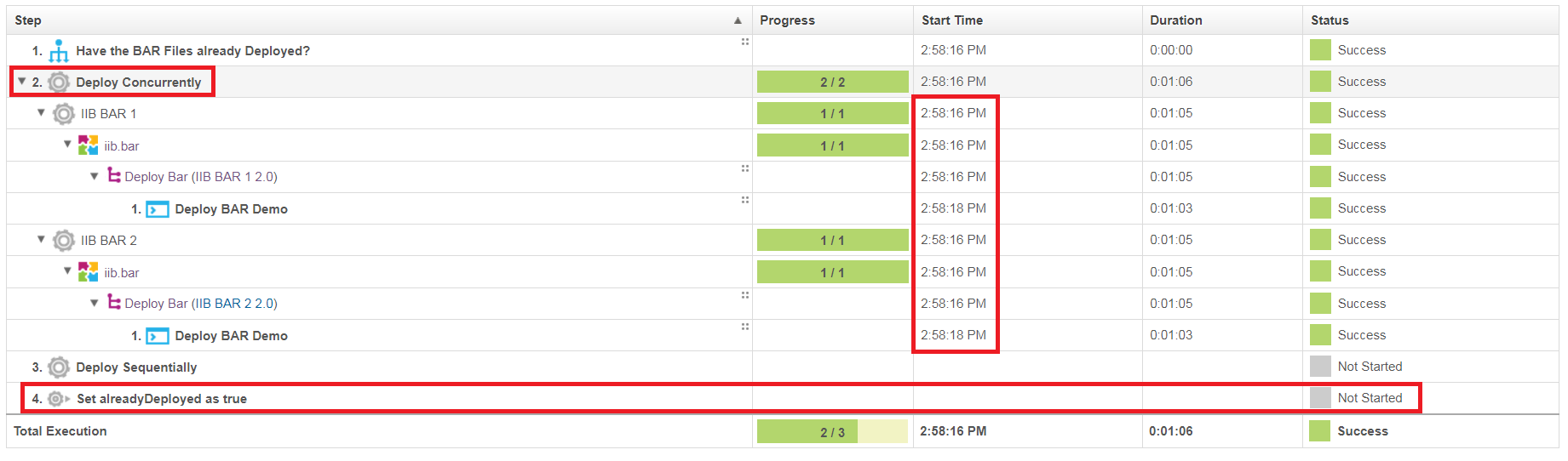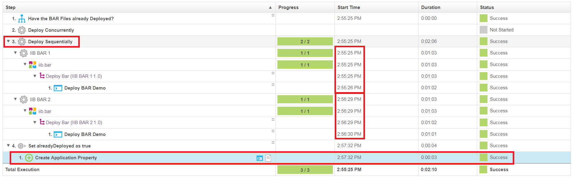 Below are the DevOps deployment logs from two different deployments. In this example, I have deployed two different components labeled IIB BAR 1 and IIB BAR 2. In the first screenshot, where the deployedAlready property was not specified, the Deploy Sequentially (Default) branch was followed. Notice that the two Deploy BAR component processes start times, which about a minute each, do not overlap. IIB BAR 1 is run separately and to completion before IIB BAR 2 begins. Once all component processes are completed, the Create Application Property process is run and the alreadyDeploy property is set.