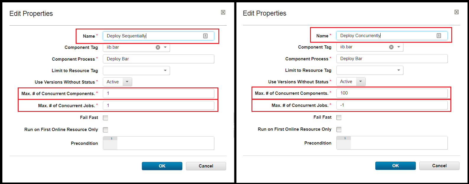 The Deploy Sequentially and Deploy Concurrently steps are very similar, but contain two major differences in their configuration. Highlighted by the red squares in the above step configuration, the Max # of Concurrent Components. and Max. # of Concurrent Jobs. have different values. In the Deploy Sequentially step, both of these values are set to 1. This forces IBM DevOps Deploy to only run a single deployment at a time. These properties are critical to ensure that there are no conflicts during BAR deployments. The Deploy Concurrently step however, may use the default values. Here IBM DevOps Deploy is enabled to run all components simultaneously and drastically decrease future deployment times. Notice that both of these configurations use the same Component Tag and Component Process. In my example, I have tagged my components iib.bar.
