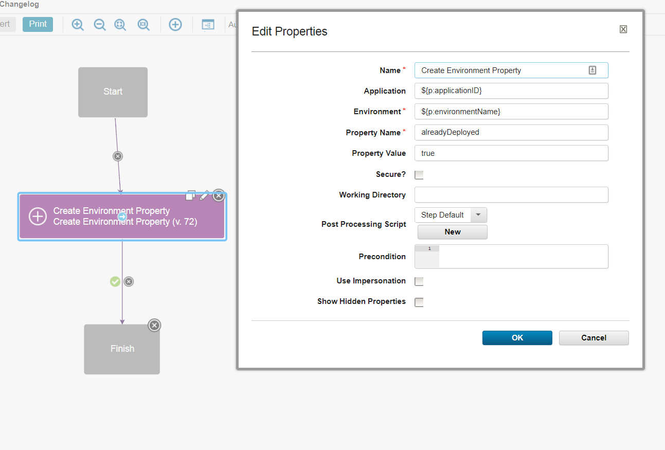 - In the generic process, replace the Create Application Property step with the Create Environment Property step. Note: The new