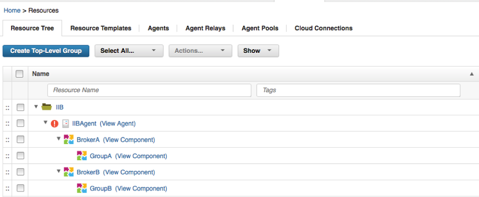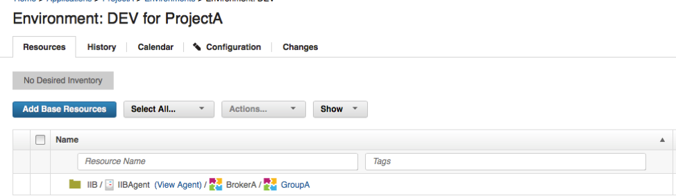 In this layout, BrokerA and BrokerB are defined at the same level, and they each have their own groups (execution groups). When I configure the UCD applications environments, I add the group as a resource: