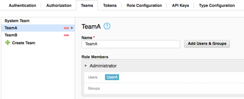 ProjectB would have its own setup similar to this as well. Then if you only wanted UserA to be able to run deployments in ProjectA, we create the UserA user in UCD and add it to a new team Ive called TeamA: