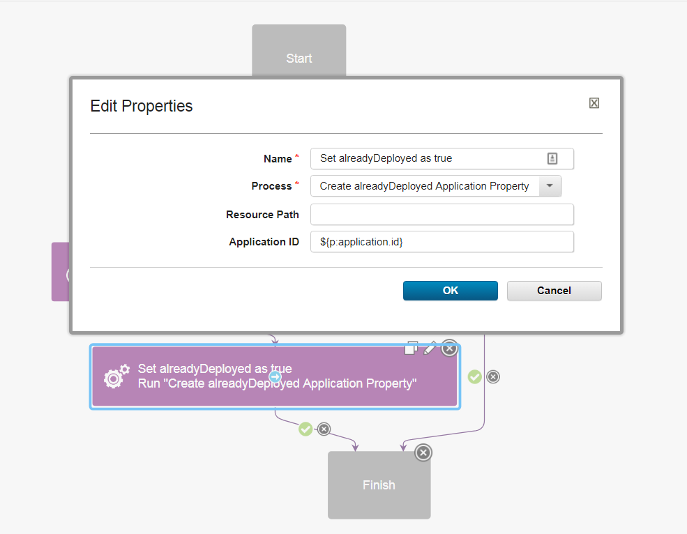 The above screenshot shows the application processs step configuration defining the Create alreadyDeployed Application Property process. You will need to use a specific application step type found under: Utility Steps > Run Generic Process . During configuration and in the above screenshot, you can see a special dynamic property called Application ID. This property was initialized in the Create Application Property process that we previously installed. Specifying ${application.id} here enables the generic process to know on which application to create the alreadyDeploy property. If you specified a Default Resource in the Create alreadyDeployed Application Property process, you can leave the Resource Path blank. Otherwise, it will need to be updated with a direct path to an agent.