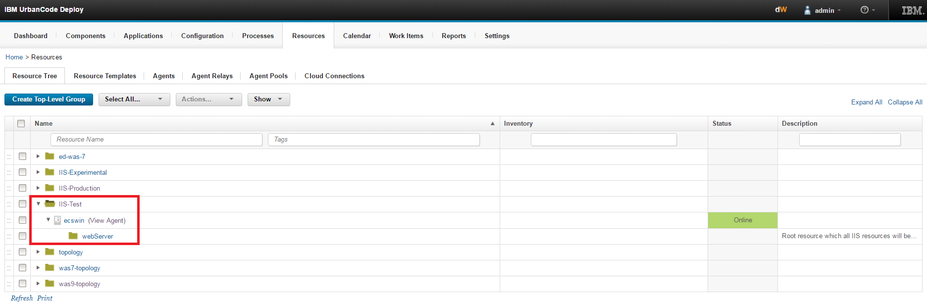 Create a top-level group in the resource tree in IBM DevOps Deploy. The top-level group is the backbone of the resources that represent the IIS environment. In the following example screen capture, the top-level group is called IIS-Test.