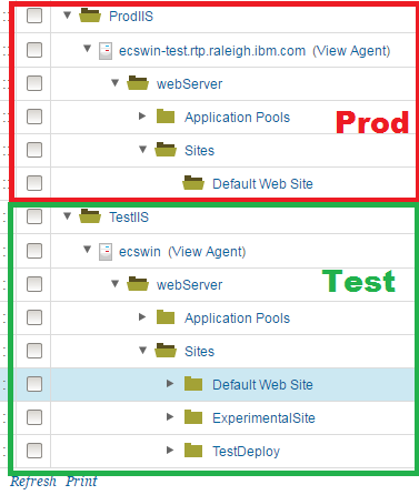The resource tree now contains two topologies: one that corresponds to the agent on the IIS Test environment, and one that corresponds to the target computer where you plan to deploy the application. The resource tree looks similar to the tree shown in Figure 4.