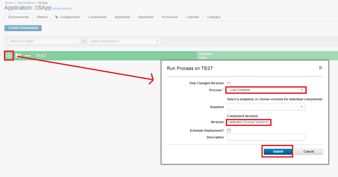 You can now run the deployment. Go back to the Environments page for your application by clicking the breadcrumbs below the tabs at the top. Click Deploy for IIS Prod. In the window that opens, select the Apply process, and for Choose Versions select the latest version for IIS Application Config, then click OK. Click Submit to deploy the application to new production environment.