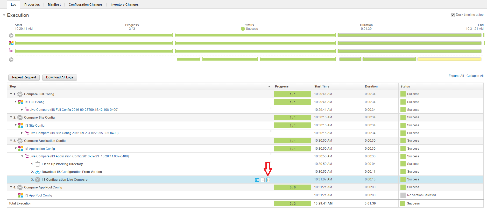 To view the configuration drift, expanding the child objects of the process request until the IIS Configuration Live Comparison plug-in step is displayed. When you hover your mouse pointer over this row, a compare icon is displayed at the right side of the Step column. Click the compare icon. Any changes between the version that you selected and the current live configuration are displayed here, highlighted in yellow and orange. To view the full comparison tree that includes unchanged assets, clear Only Show Changes at the upper left. See Figures 3-5 for visual reference.