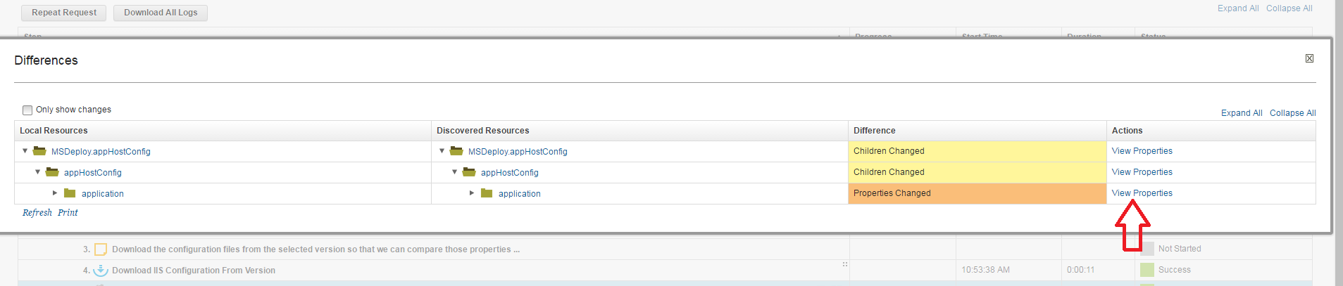 Figure 4. The Differences window that is displayed after you click the compare icon. The arrow points to the link to view changed properties.