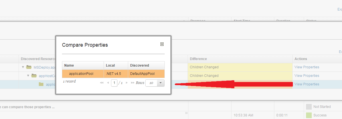 Figure 5. The Compare Properties window that is displayed after you click View Properties. The Compare Properties window shows the changed properties.