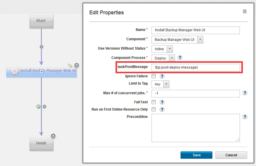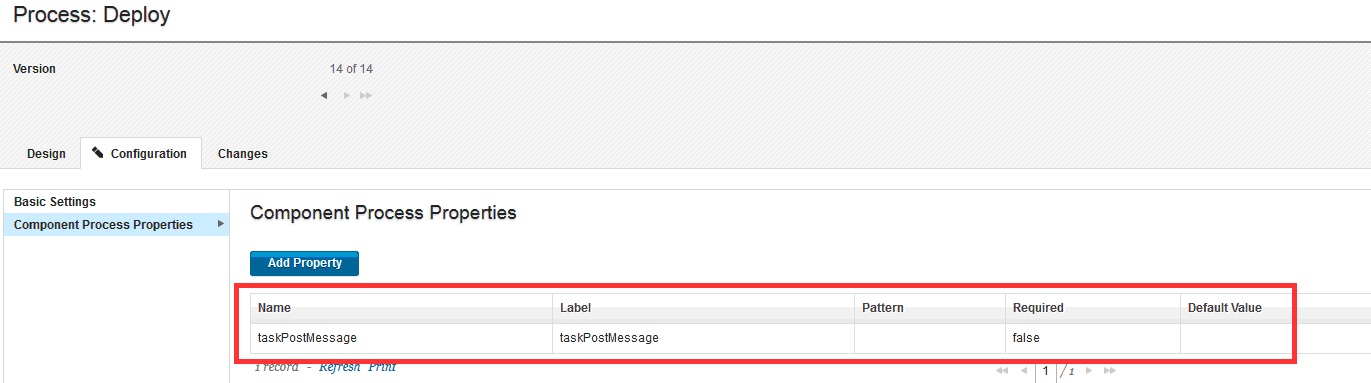 - In the application process, use the new property to pass the value of the post-deploy-message property. On the Edit Properties page for the application process, specify