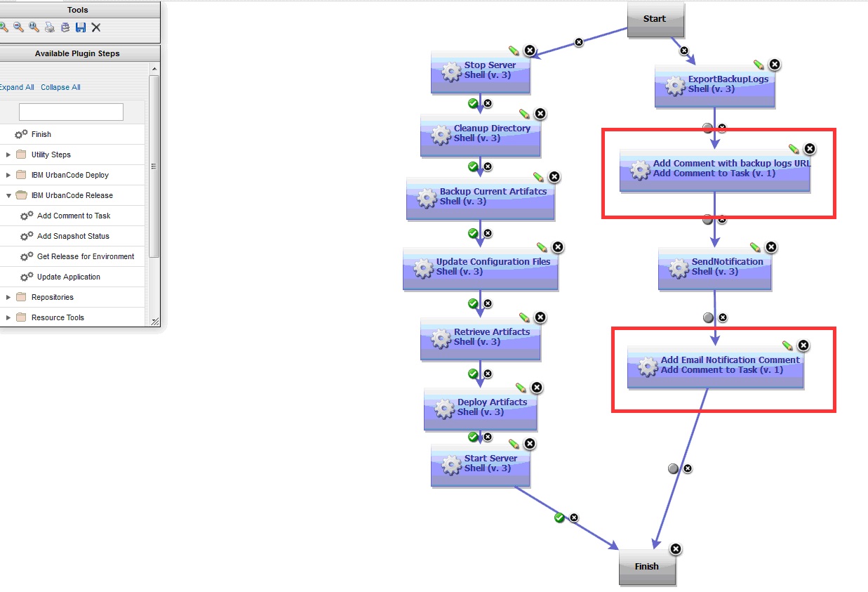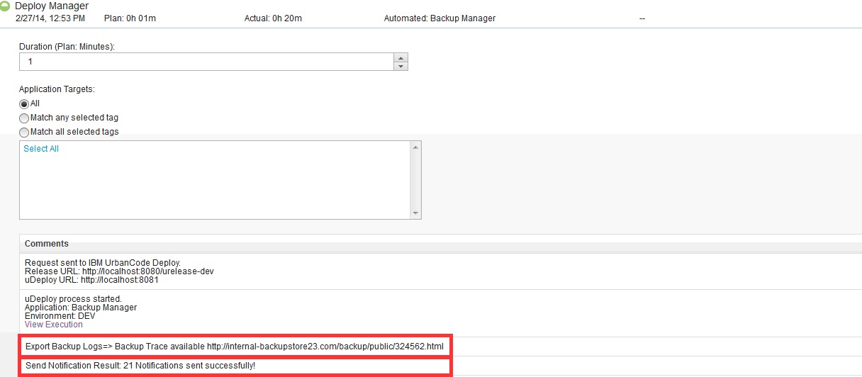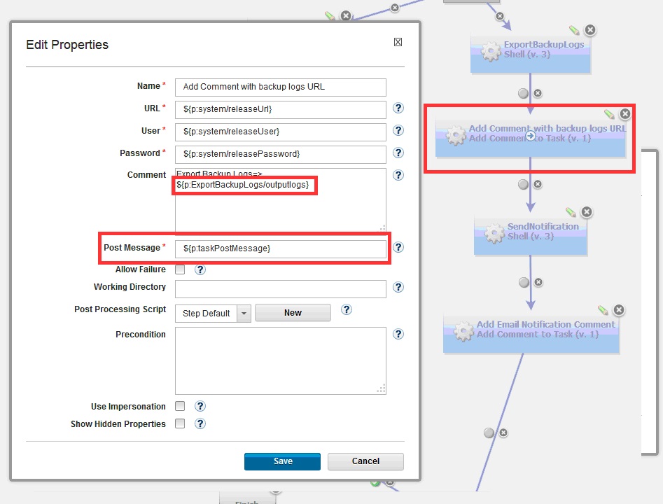 TheExportBackupLogs step uses an external tool to archive backup logs to a web server during processing. An automatically-generated URL is included in the steps output. By using a post processing script, you can scan the steps output and retrieve the URL and save it to a property that can be passed to the subsequent step. The following step, Add Comment with backup logs URL, uses the output property to create a comment in IBM DevOps Release.