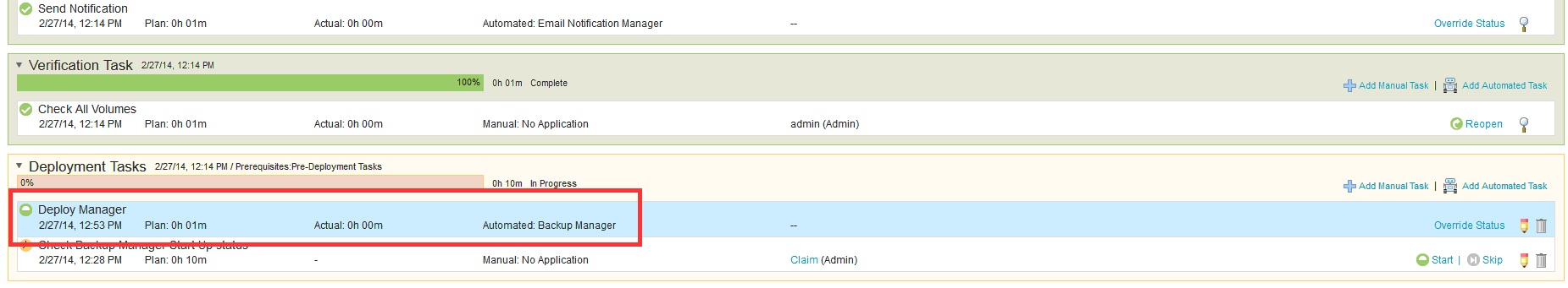 In this example, comments are added to an IBM DevOps Release automated task in a scheduled deployment. The comments are generated from the output logs of two steps in an IBM DevOps Deploy component process. The following figure shows the requesting automated task in IBM DevOps Release.