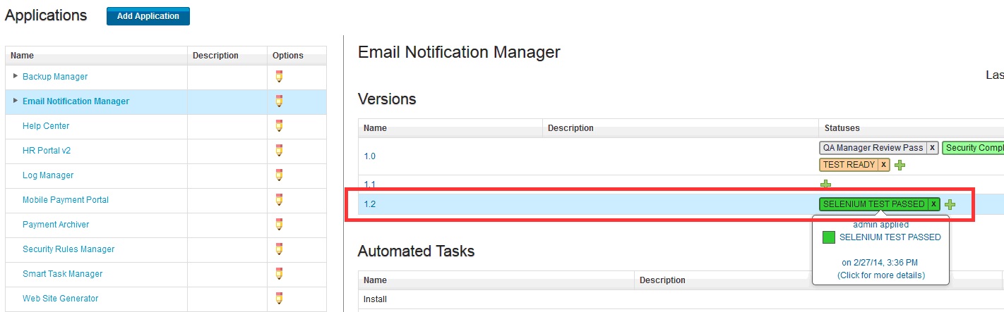 After completion of the Selenium test, the SELENIUM TEST PASSED status is added to the snapshot. The following figure shows the status applied to the Install Notification Manager application version in IBM DevOps Release.