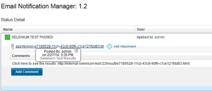 In this example, the Add Snapshot Status step is used to apply a status to a snapshot, based on the test results of the Install Notification Manager application. This application is an automated Selenium test that is run on a snapshot version.The application process is triggered by a scheduled deployment in IBM DevOps Release. When the test runs, the results are posted to an external web page. Using the Add Snapshot steps also provides the external URL as a comment and attaches a file that contains additional test details.