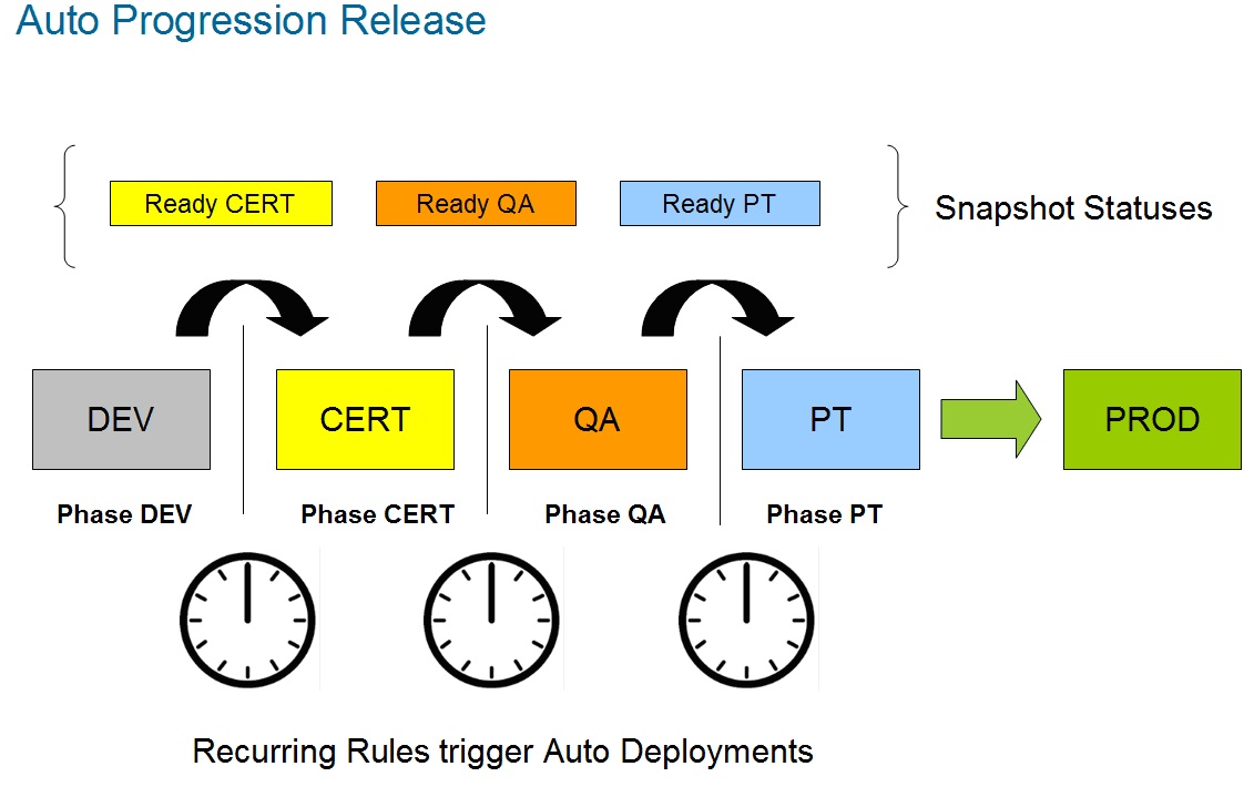 When you deploy an application version to a DEV environment, say, a snapshot is created of all component versions that are deployed in the environment. This snapshot is automatically included in the IBM DevOps Release inventory. As soon as the snapshot acquires the required statuses, the recurring rule creates a scheduled deployment of that version for the next phase. By using recurring rules, application versions can be automatically deployed to every phase in the lifecycle through to production as shown in the following figure.