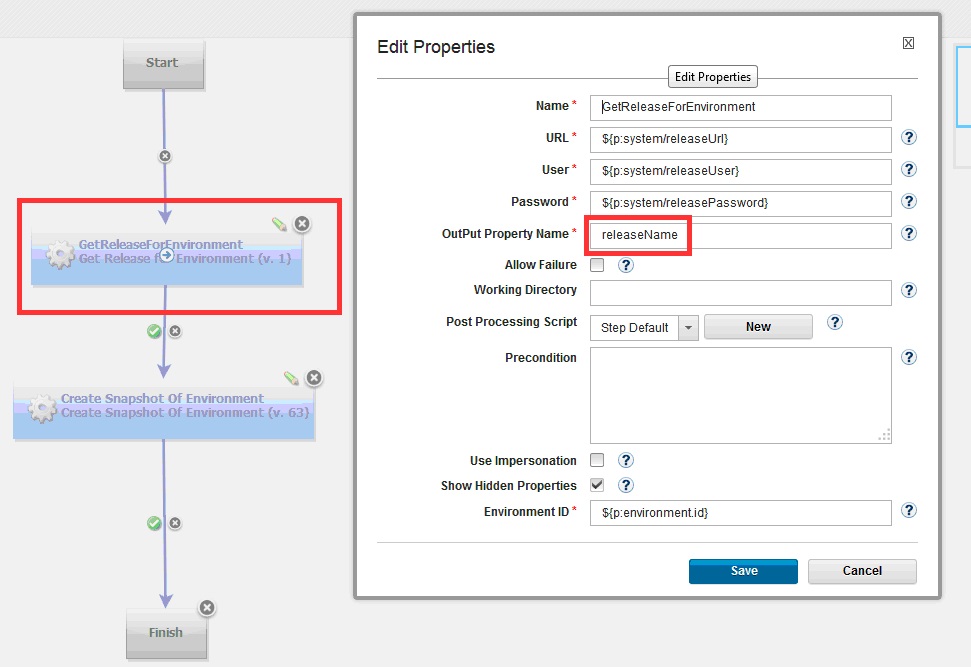 The following figure shows the settings for the Get Release for Environment step. In this example, the Output Property Name property is named releaseName.