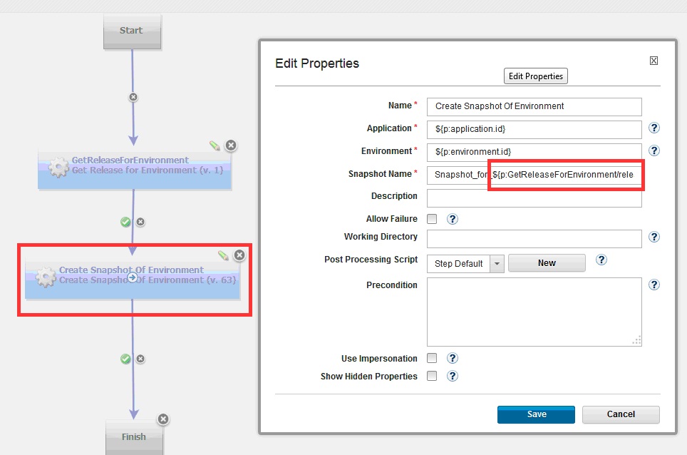 The releaseName output property is passed to the next step in the workflow as ${p:GetReleaseForEnvironment/releaseName}, as shown in the following figure.The Create For Environment step creates a snapshot by using the naming pattern that the recurring rule expects.