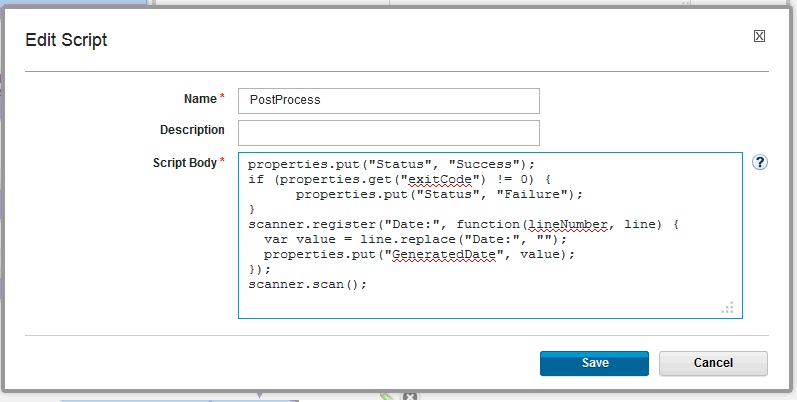 In this example, the post-processing script is called exportOutputLogs. A post-processing script is a JavaScript script that automatically runs when a step completes processing. In this example, the script scans the output logs of the step. properties.put(Status, Success) if (properties.get(exitCode) !=0){ properties.put(Status, Failure); }``