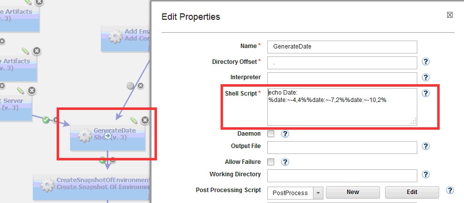 - Use a post-processing script (described in Adding comments to a task) to read the output date. Then make the date available to the following step by storing it in an output property. This figure shows a shell step that captures the system date: