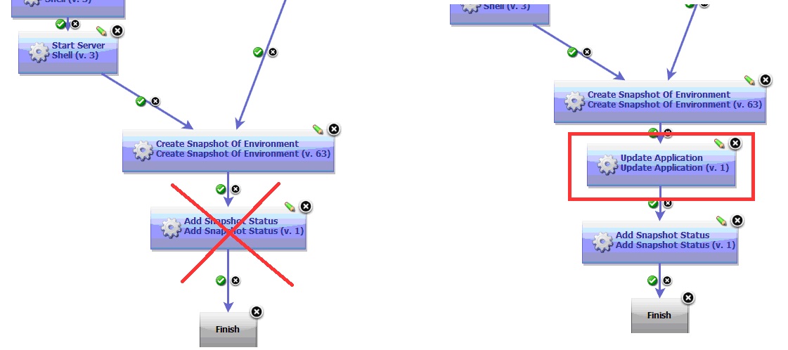 If the selected snapshot does not exist in IBM DevOps Release, the process fails. You can ensure that the snapshot exists by running an integration process before you run the application or use the Update Application step to the workflow. By using the Update Application step, you ensure that the snapshot exists in the IBM DevOps Release inventory before it is referred to.