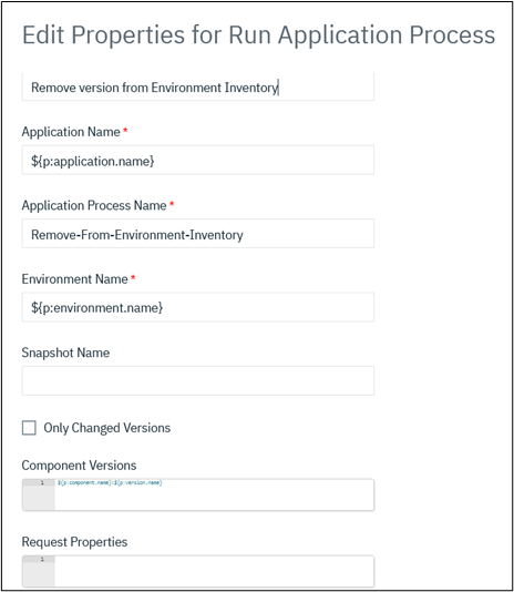 The Run Application process step should point to the uninstall application process and all other values should be UCD properties like below