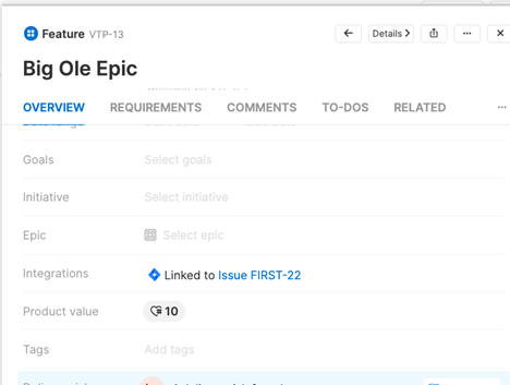 After you have linking between AHA! Features and Jira issues, your features in AHA! will show that Also notice the “Product Value” field (which is set to 10 in the picture). This is the data that the Velocity AHA! Integration will import. So, your Jira linked features in AHA! will need to be configured with product values (which is the entire point of the Velocity AHA! integration.)